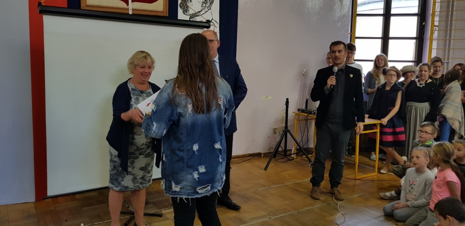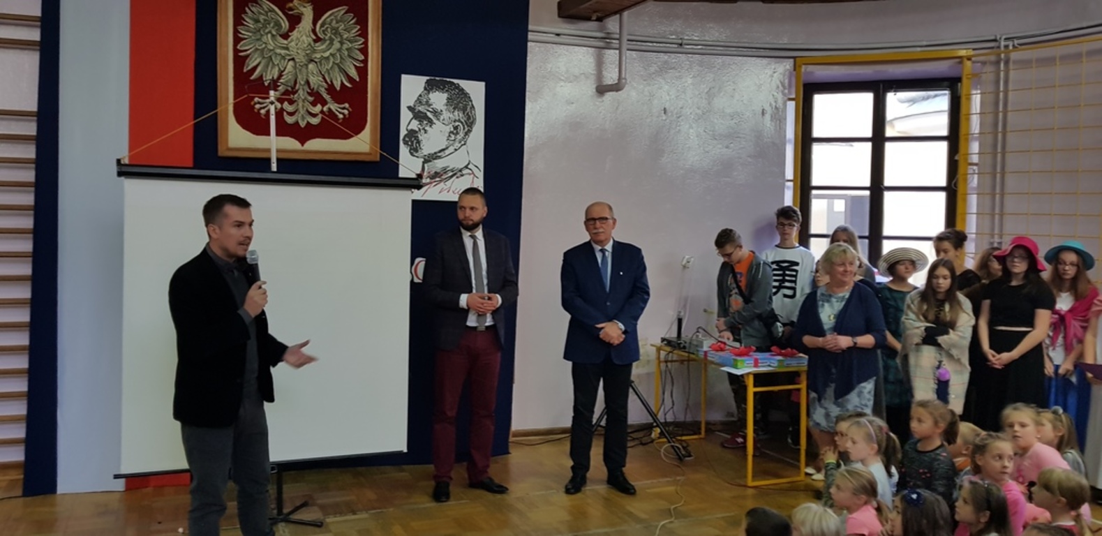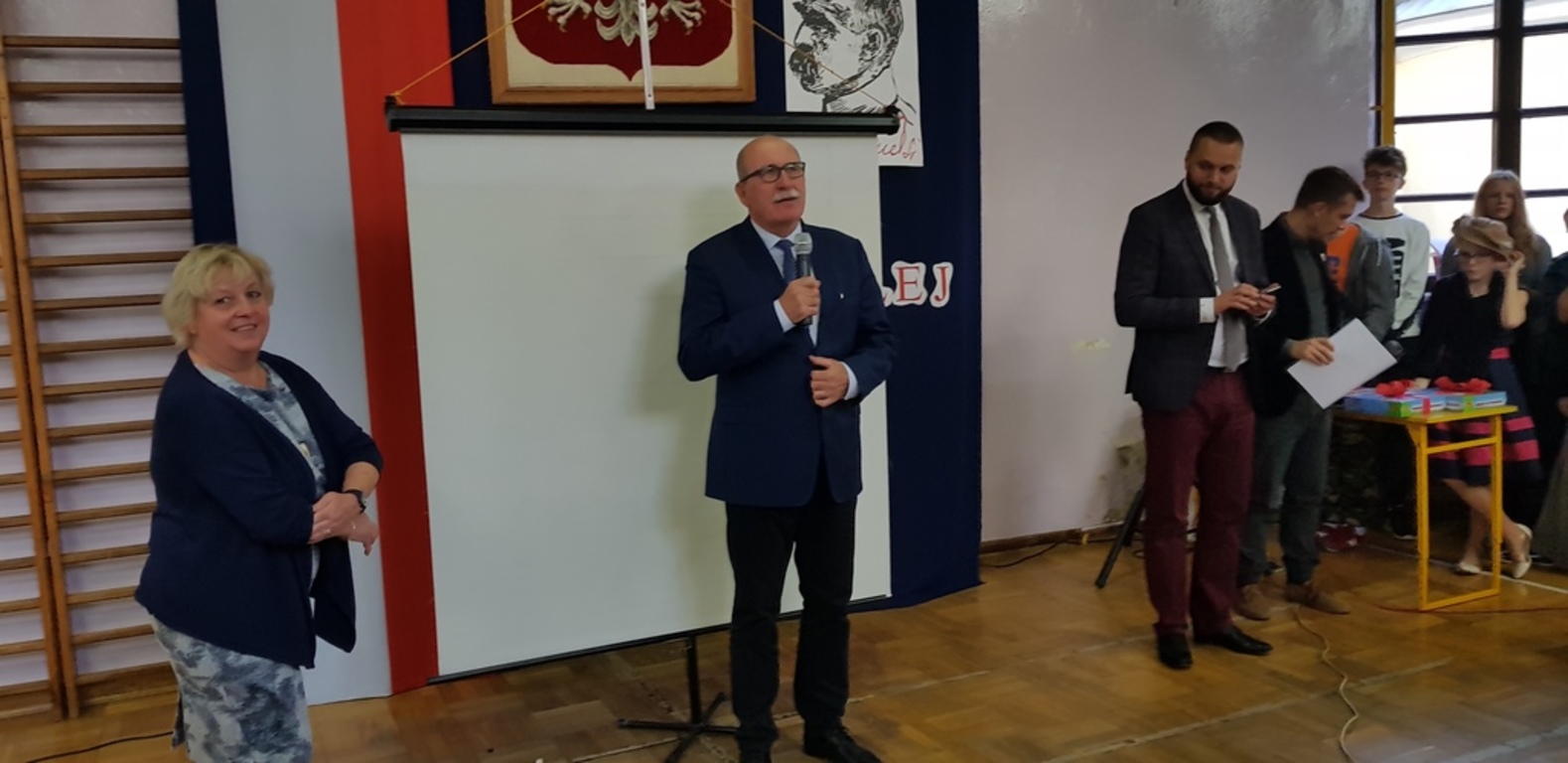Po powrocie patrolów do szkoły dyrektor PSP nr 3, pani Beata Górecka, przywitała Pana Burmistrza Jacka Stolarskiego oraz Pana Burmistrza Karola Biedrzyckiego, którzy swoją obecnością uświetnili nasze obchody. Pan Jacek Stolarski objaśnił uczniom jak ważne jest poznawanie historii swojej małej ojczyzny i jak ważne jest, abyśmy wspólnie umieli się cieszyć z tego, że jesteśmy wolni i niezależni